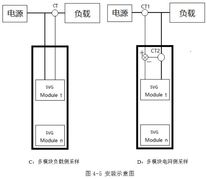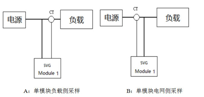 SVG并联安装在系统中,电流互感器CT可在触摸屏上任选接于电网侧或负载侧,默认是选择负载侧安装,如果现场为采样电网侧的话,多模块并联的机柜内需要将电网CT信号与装置输出总电流CT信号相减得到负载侧电流,作为采样信号输入到模块内。共有如下接线方式: