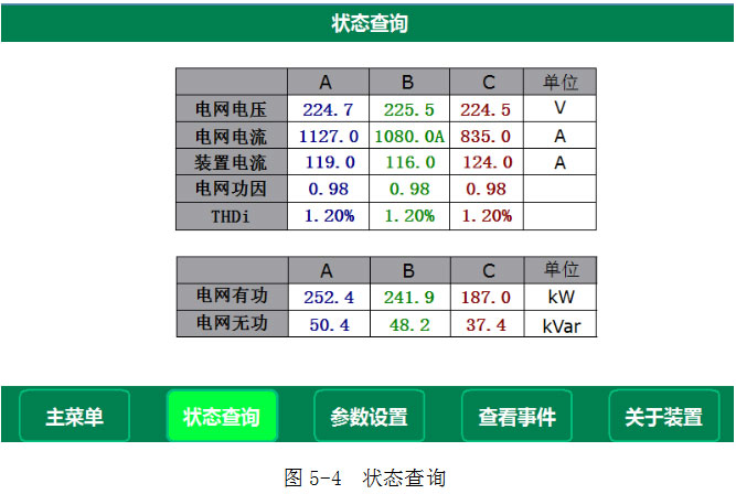 装置状态:“正常”或者“故障”。表示是否工作正常,在上电后以及运行过程中装置都会实时自检。如开机后显示为“故障”,则请勿“点击开机”,请先通过“查看事件”页面排查故障原因。