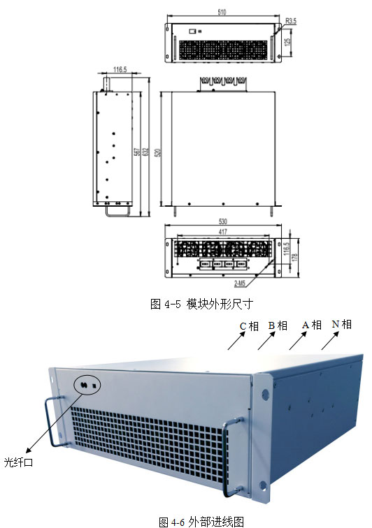 ZLDL-APF机箱进线端有电源端子和CT输入接线端子。ZLDL-APF前面板设计有操作控制面板提供基本运行状态和告警信息显示。