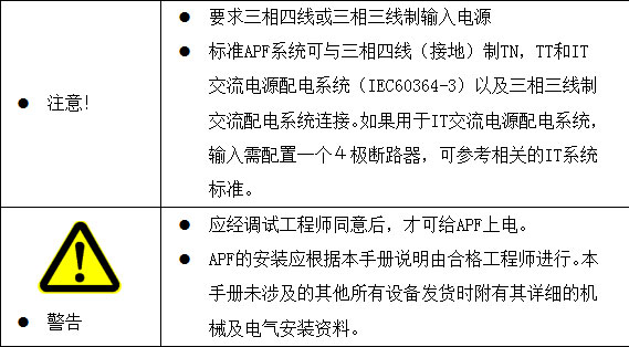 必须在壁挂式ZLDL-APF系统外部交流电源输入处安装断路器或其它保护器件。本章为合格安装工程师提供一般性指导。合格安装工程师应了解有关待安装设备的当地接线规定相关知识。