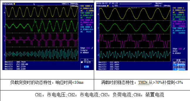 1. 可同时滤除2~50次以下的谐波电流,满载时使电源侧电流畸变率THDI<3%,半载时THDI<4%;