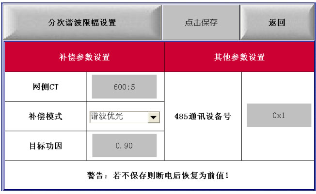 谐波限幅设置1APF 1-50次基波无功补偿及谐波滤除限幅值设置。