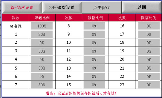 分次谐波限幅设置:APF 1-50次基波无功补偿及谐波滤除限幅值设置。