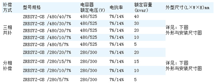 注:以上型号为第四代产品;电抗率为7%或14%可选,电容器额定电压可选。