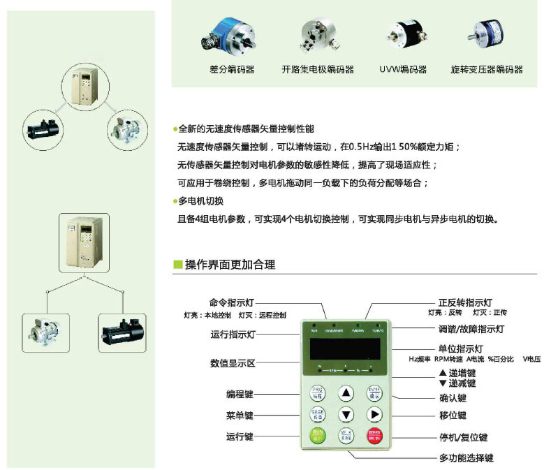 支持三相交流异步电机,三相交流同步电机的矢量控制,支持不带绝对位置反馈的永磁同 步电机矢量控制;